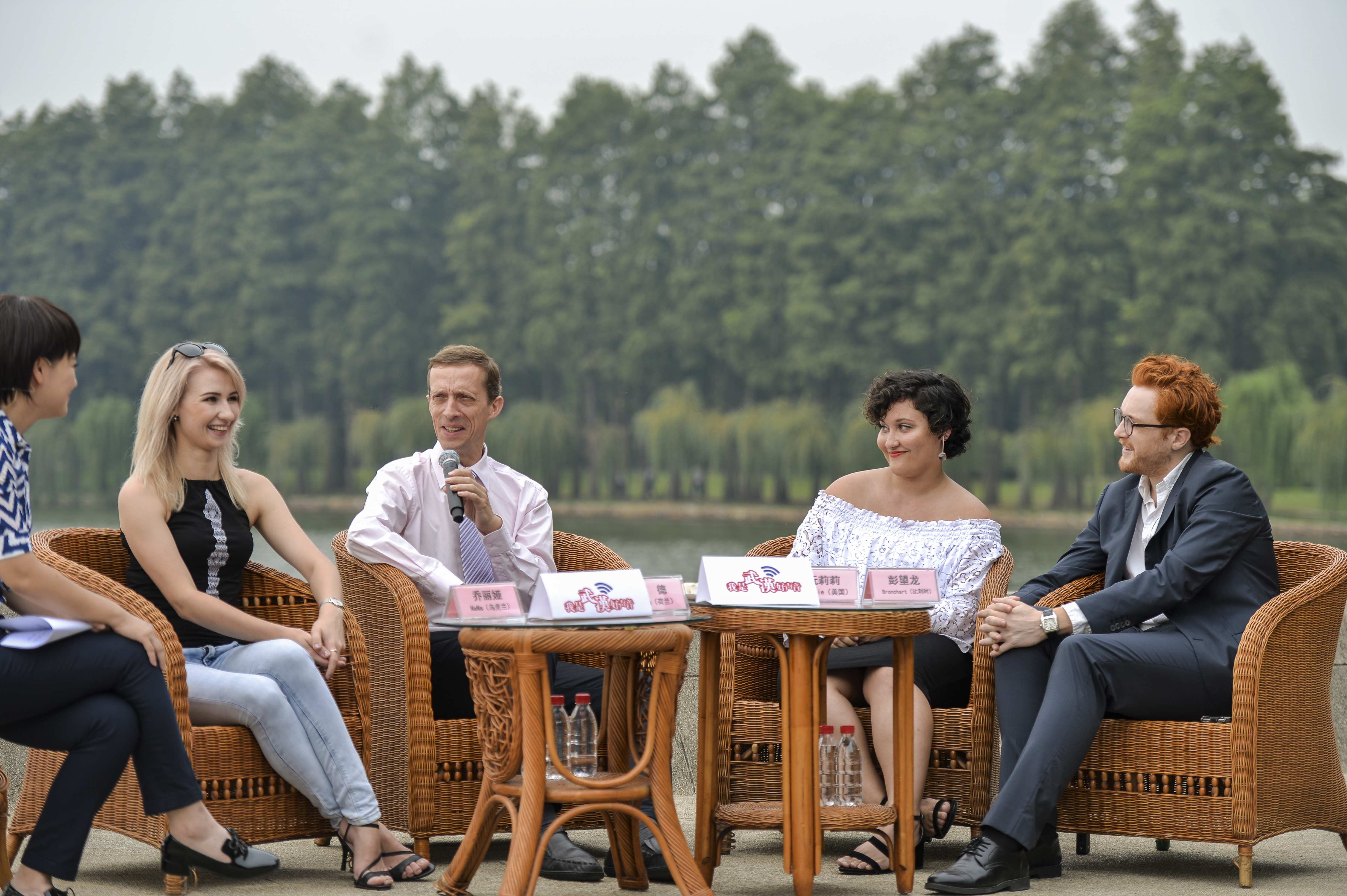 (外国友人乔丽娅、律德、阮莉莉、彭望龙谈武汉。 胡冬冬 摄)