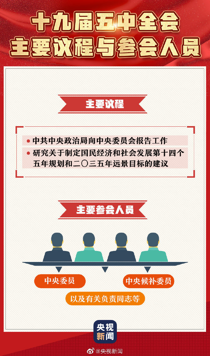 中国共产党第十九届中央委员会第五次全体会议,于10月26日至29日在北京举行。主要议程是,中共中央政治局向中央委员会报告工作,研究关于制定国民经济和社会发展第十四个五年规划和二〇三五年远景目标的建议。今天,一组图带你了解十九届五中全会。