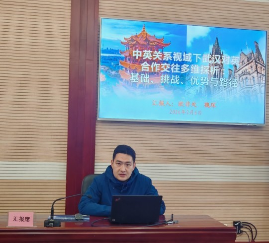 欧非处魏琛同志以《中英关系视域下武汉对英合作交往多维探析:基础、挑战、优势与路径》为主题,系统回顾了中英关系的历史脉络与阶段性特征,重点梳理了中英合作的总体机遇与挑战,并结合英国首相斯塔默最新访华成果,以及武汉对英现实基础、主要挑战和独特优势,围绕助力武汉“五个中心”建设,提出下一步对英合作交往发展路径。