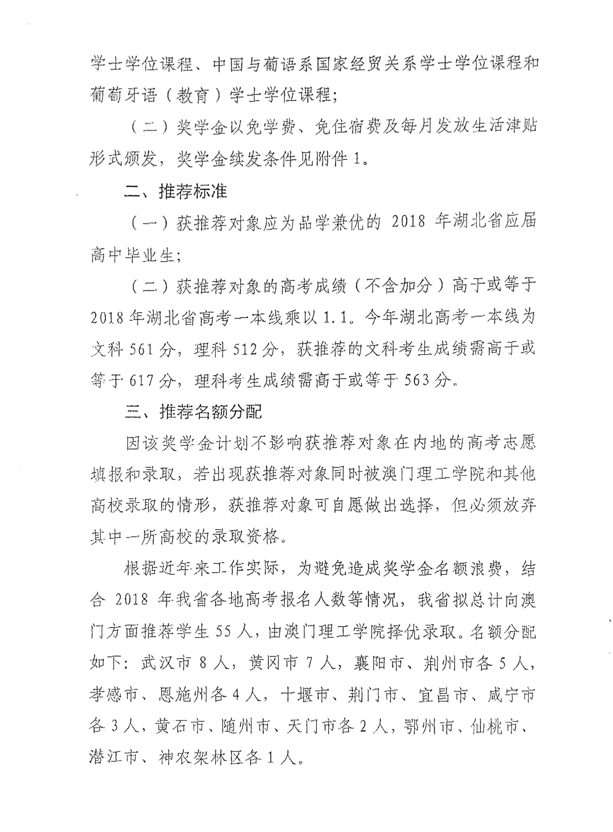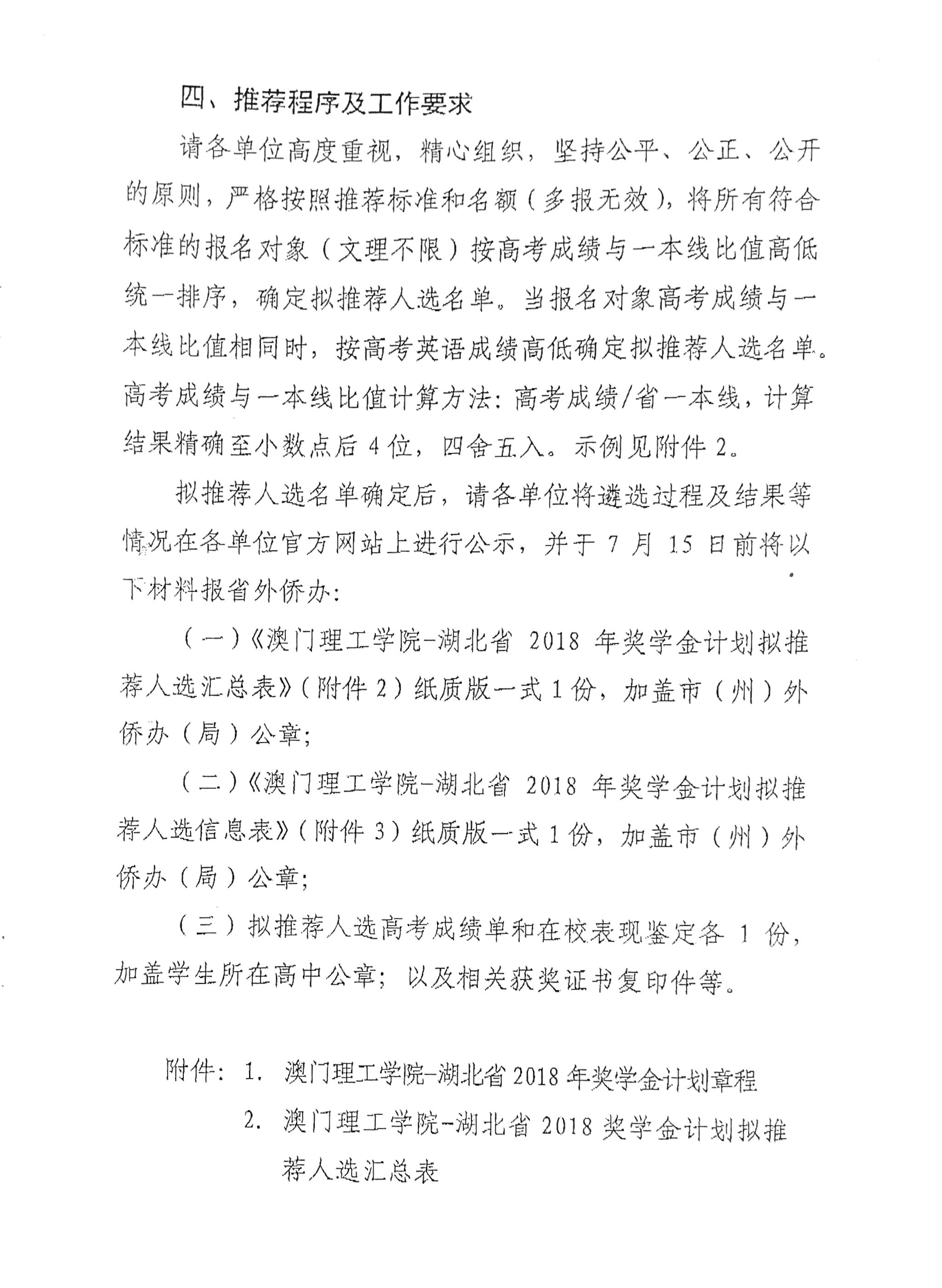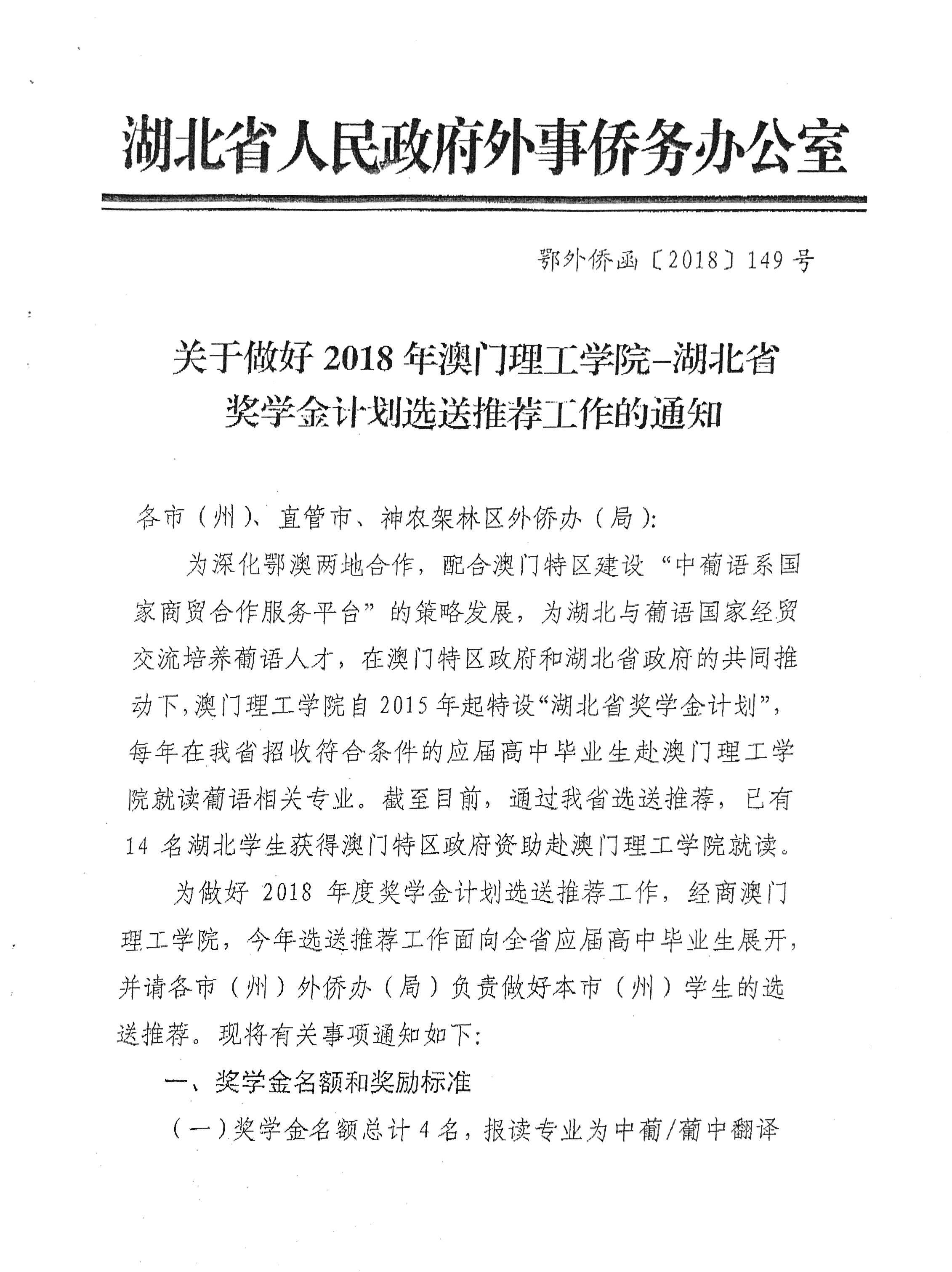 根据省外侨办《关于做好2018年澳门理工学院-湖北省奖学金计划选送推荐工作的通知》(鄂外侨函〔2018〕149号)精神要求,为公正公开做好我市2018年澳门理工学院-湖北省奖学金计划选送推荐工作,特在我办网站通知公告上转发此通知。