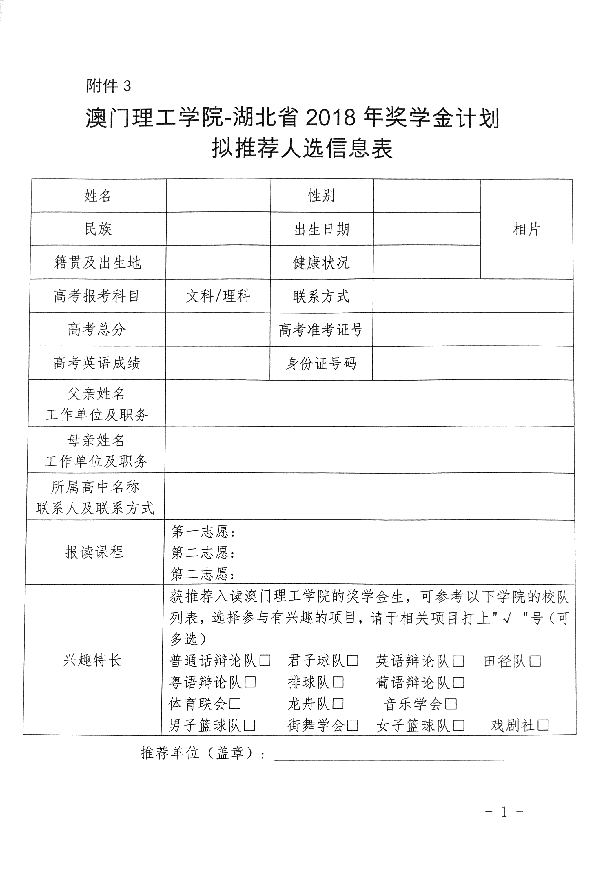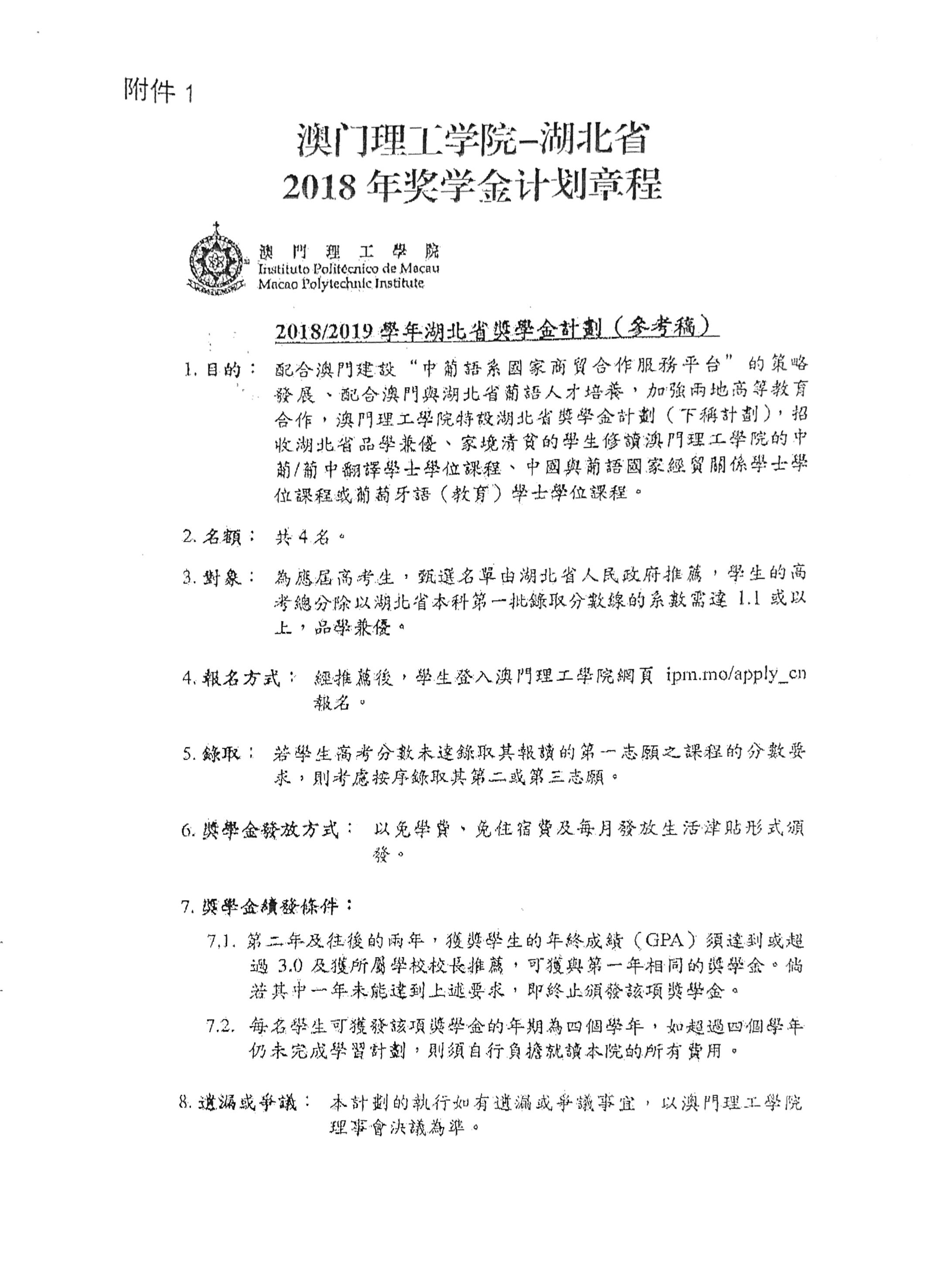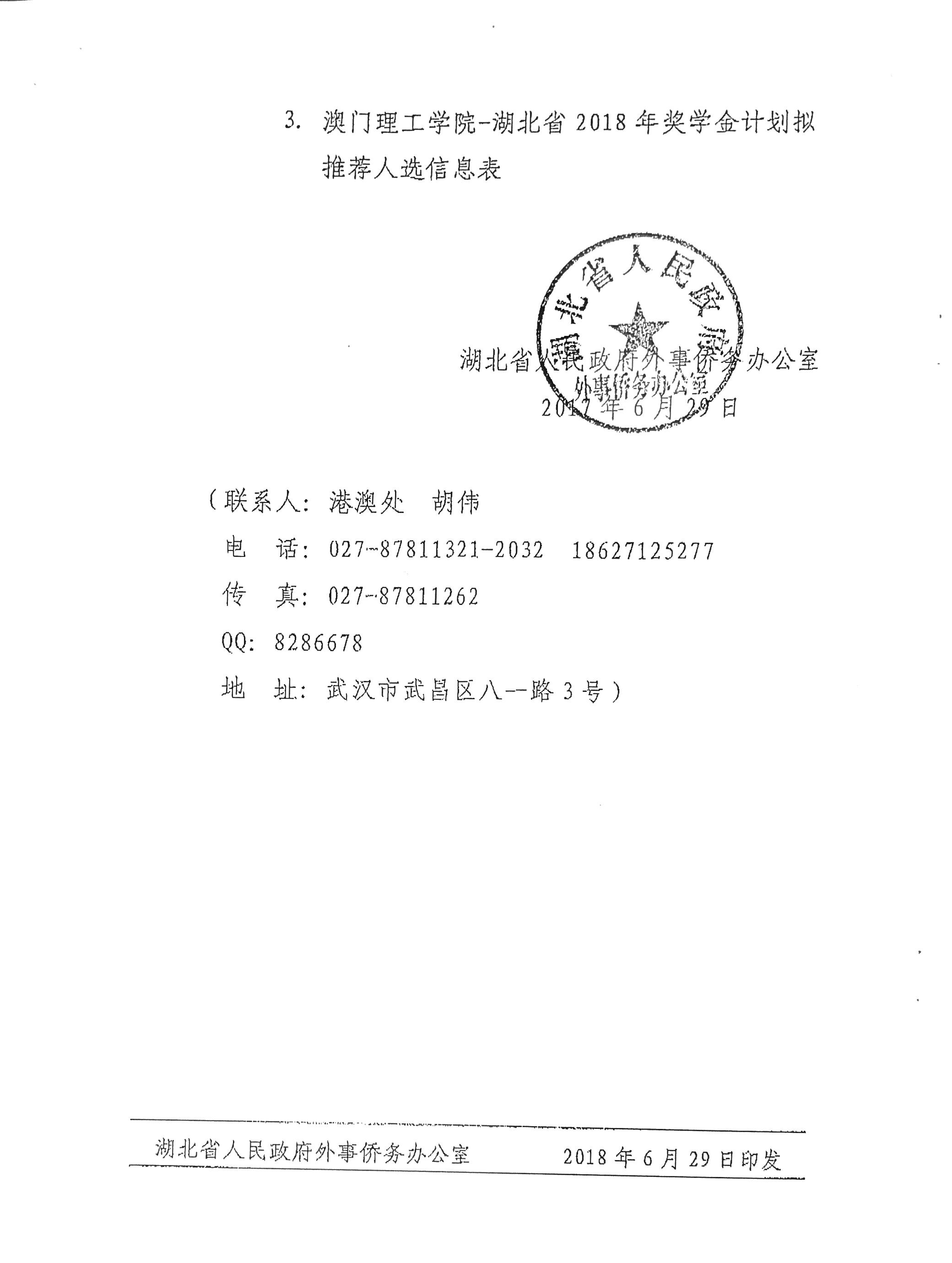 根据省外侨办《关于做好2018年澳门理工学院-湖北省奖学金计划选送推荐工作的通知》(鄂外侨函〔2018〕149号)精神要求,为公正公开做好我市2018年澳门理工学院-湖北省奖学金计划选送推荐工作,特在我办网站通知公告上转发此通知。