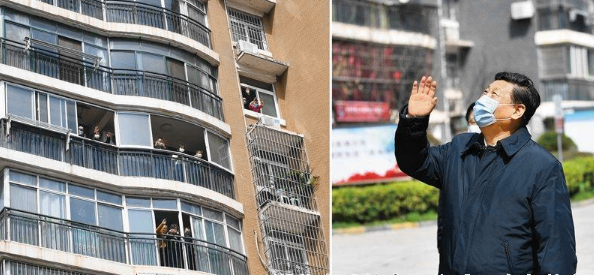 2020年3月10日,中共中央总书记、国家主席、中央军委主席习近平专门赴湖北省武汉市考察新冠肺炎疫情防控工作。这是习近平在东湖新城社区考察时,向在家隔离居住的居民挥手致意、表示慰问(拼版照片)。新华社记者 谢环驰/摄